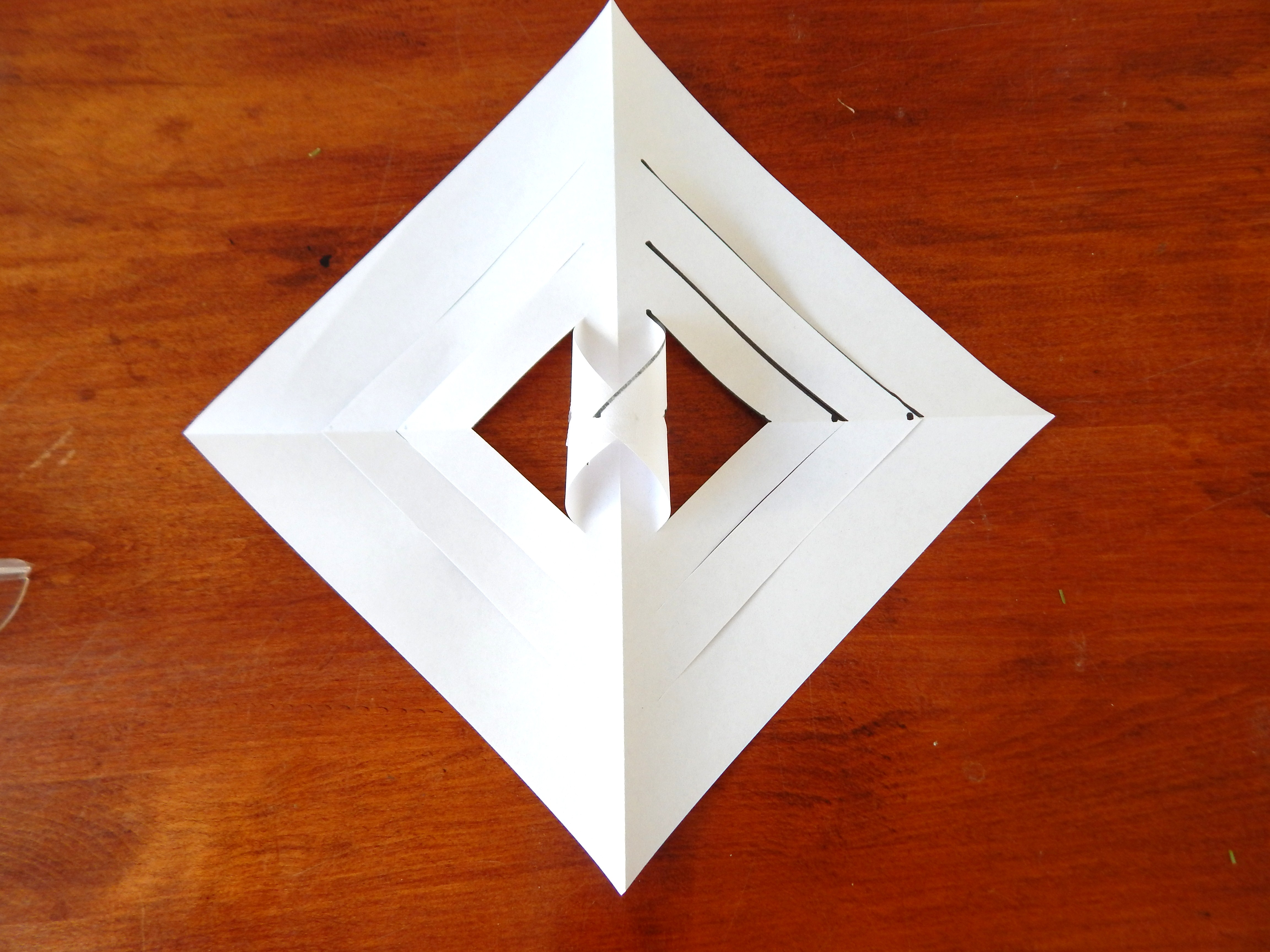 NOTES: To create a smaller snowflake, you can simply begin with smaller size squares of 6″, 5″, or 4″. Regardless of what size you decide on, remember that all six squares need to be identical in size. Just keep in mind that the smaller in size that you go, the finer the work needs to be with your fingers.